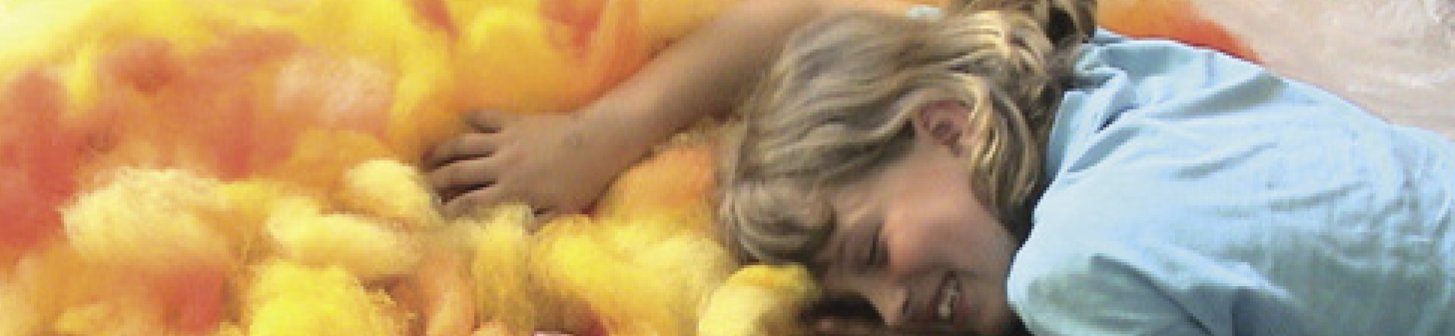 Das Foto links zeigt, wie die Kinder die Wolle aufzupfen und in die Luft werfen. Spielerisch lernen sie dabei, wie fein, locker und leicht Wolle ist.